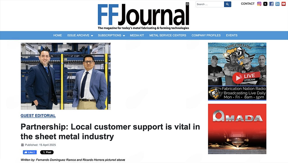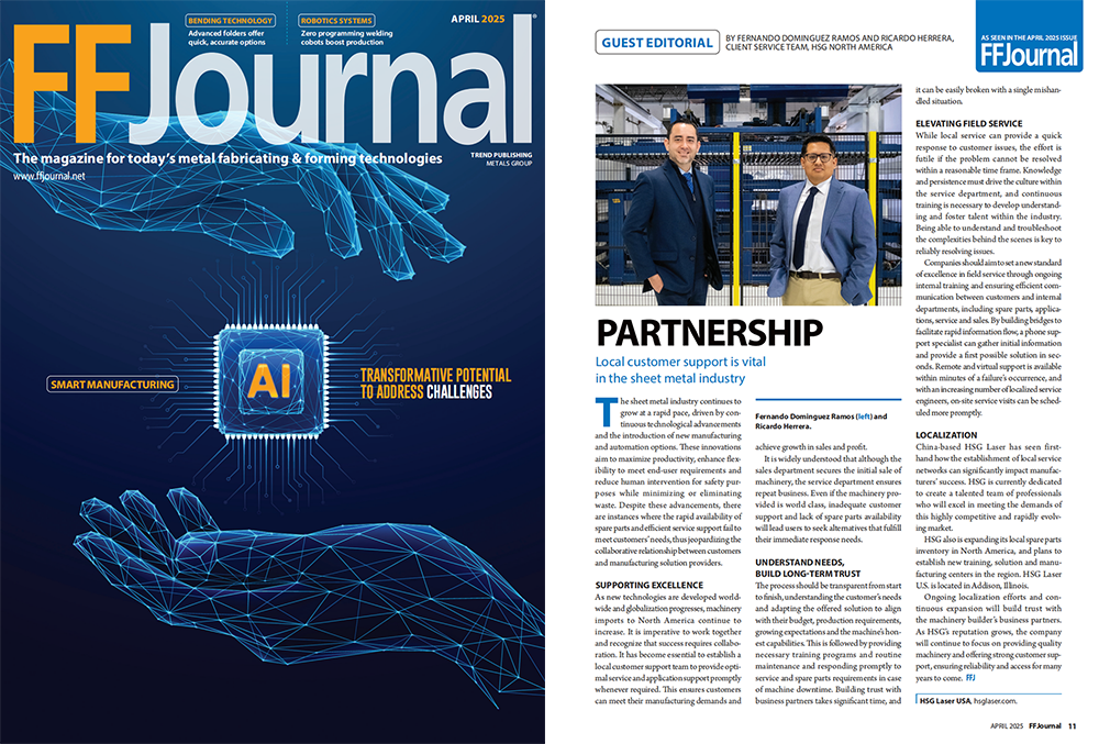 近日,宏山激光HSG Laser憑借在北美市場(chǎng)持續(xù)深化的本地化服務(wù)實(shí)踐,榮登北美金屬加工權(quán)威雜志《FFJournal》2025年4月刊。本期雜志特別刊載了由HSG北美區(qū)域團(tuán)隊(duì)成員Fernando與Ricardo聯(lián)合撰寫的專題文章,聚焦“合作伙伴關(guān)系”主題,系統(tǒng)闡述了本地化售后服務(wù)和備件保障對(duì)于制造企業(yè)運(yùn)營(yíng)效率與客戶信任構(gòu)建的重要價(jià)值。